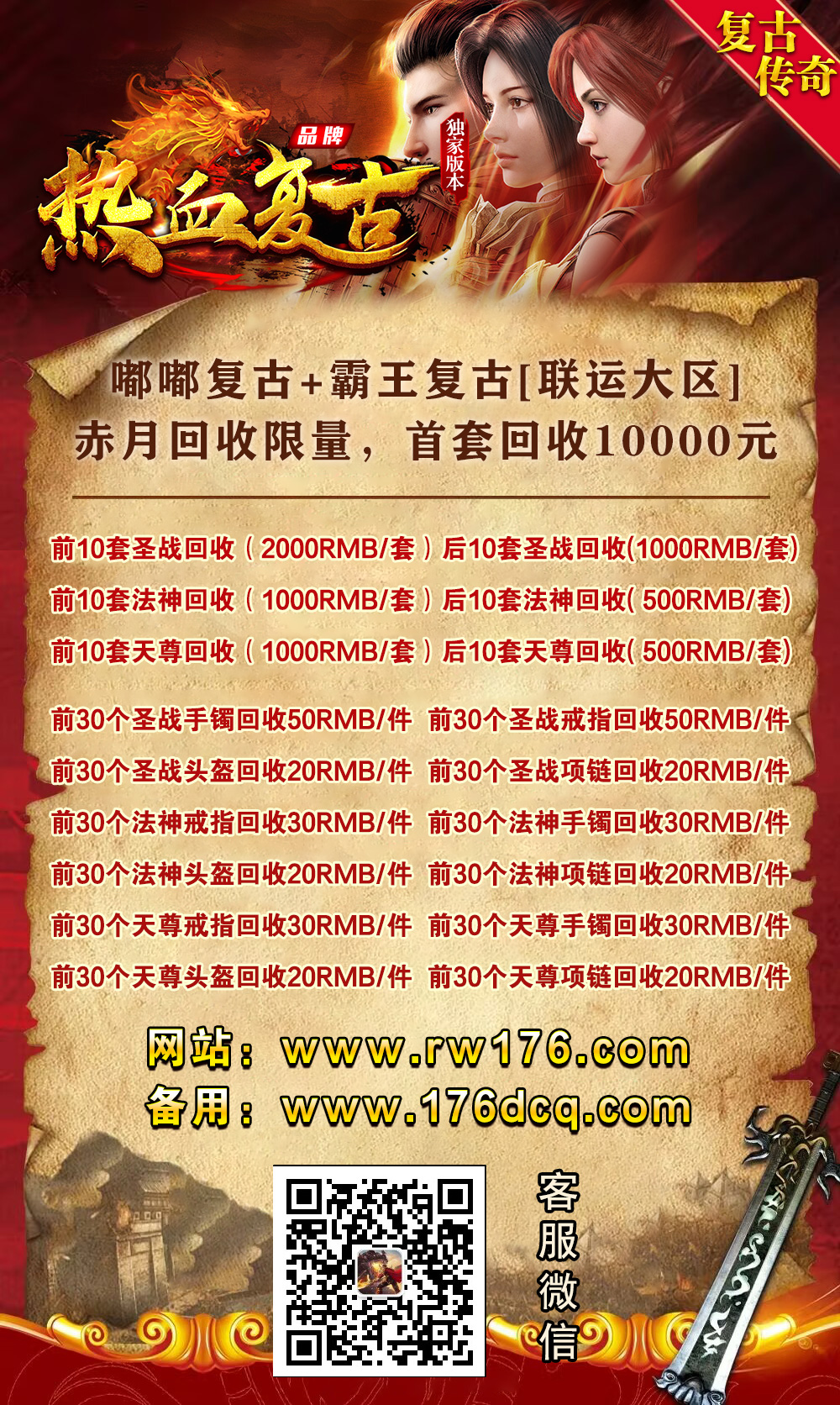 【职业平衡】:精心把三职业的均衡做到了极致,法师打宝,道士辅助,战士双烈火PK越货。